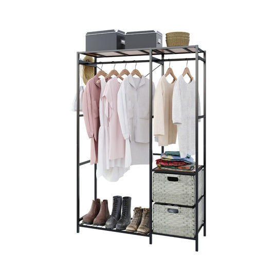 Garment Rack With Shelves, 2 Wicker Drawers, 4 Hooks, Organizer
