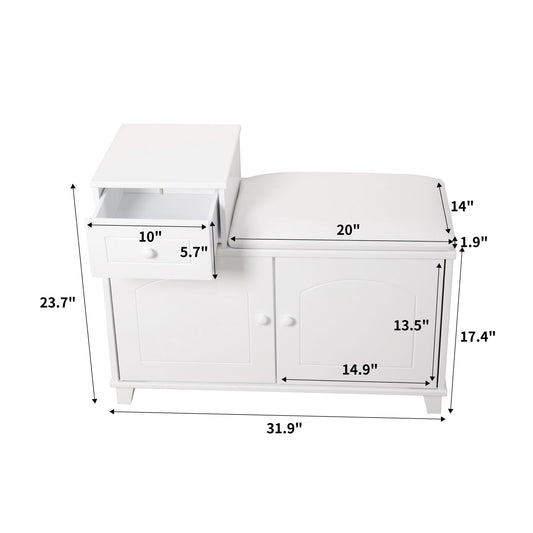 Shoe Storage Bench Cabinet With Fireproof Cushion, Double Doors And Movable Drawer For Door Entrance - White