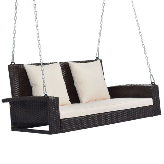 2 Person Wicker Hanging Porch Swing With Chains, Cushion, Pillow, Rattan Swing Bench For Garden, Backyard