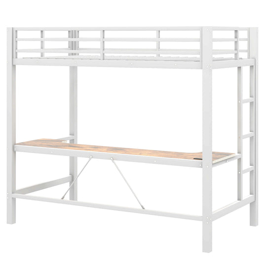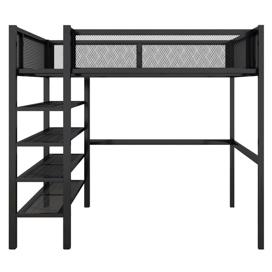Metal Loft Bed With Desk, 3 Shelves And Ladder
