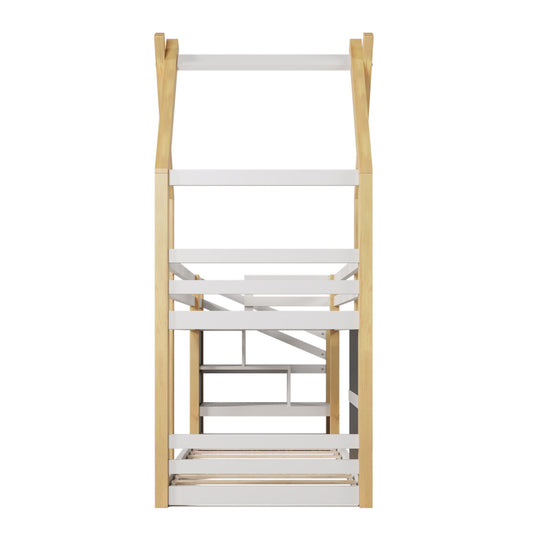 Twin Over Twin House Bunk Bed With White Storage Staircase And 2 Blackboards - White / Natural