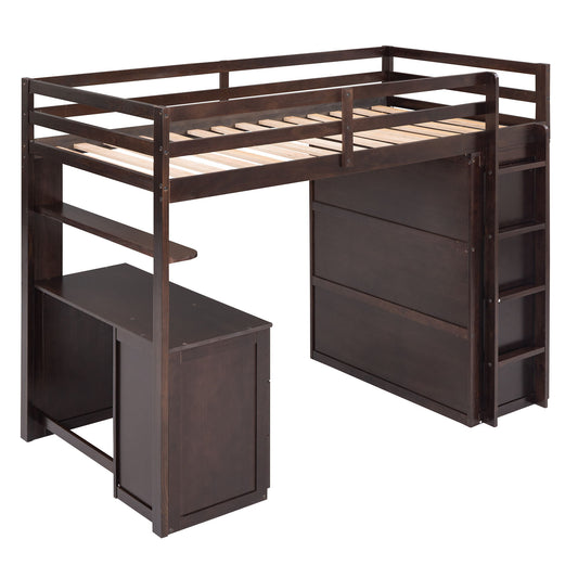 Loft Bed With A Twin Size Standalone Bed, Shelves, Desk, And Wardrobe