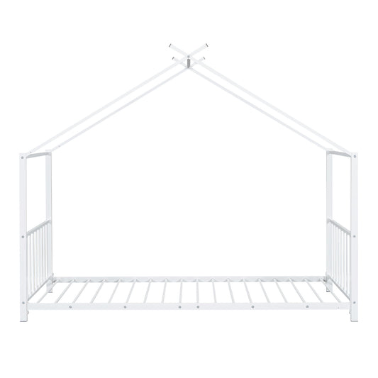 Floor Wooden Bed With House Roof Frame, Fence Guardrails