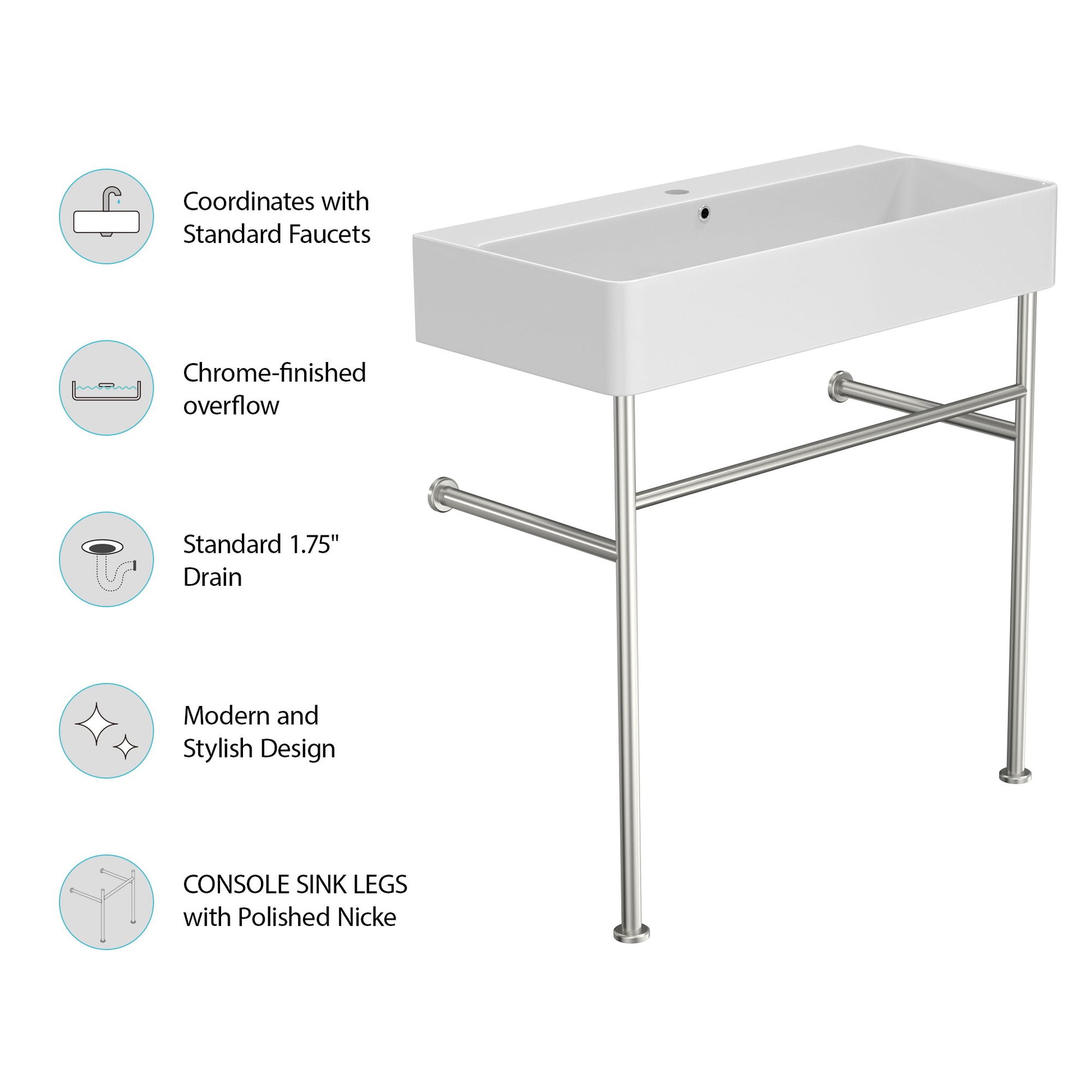 31.5" Ceramic Bathroom Console Sink With Overflow Polished Nickel Legs Modern Vanity Basin - White